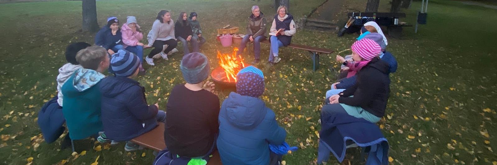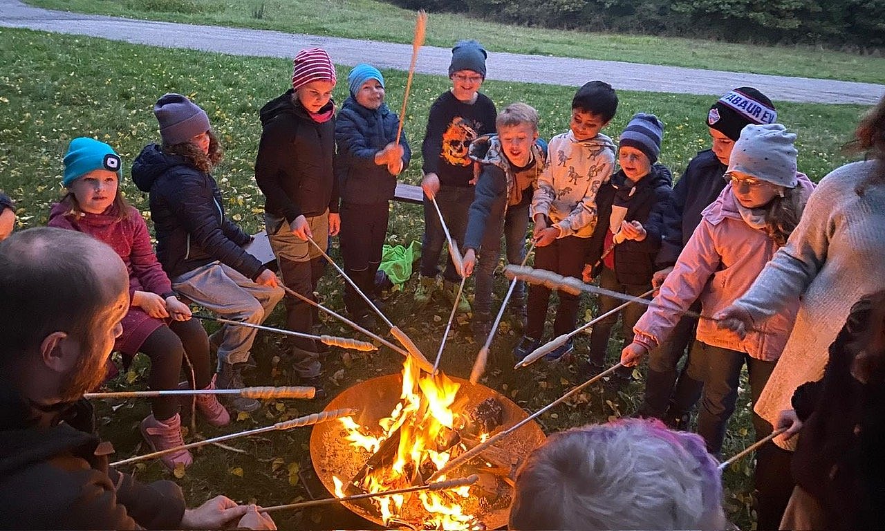 Die Gruppe traf sich am Ortsrand von Holler und startete von dort zu einem kleinen Spaziergang zum Asbach-Kreuz. Dort war bereits ein Lagerfeuer entzündet und die Kinder setzten sich auf Bänke rund um die Feuerstelle. Mit einer Geschichte aus Astrid Lindgrens „Wir Kinder aus Bullerbü“ hatte Bücherei-Mitarbeiterin Sarah Pfeil zum Start einen echten Klassiker der Kinderbuchliteratur im Gepäck. Nach der Geschichte gab es für jedes Kind einen Stab und Stockbrotteig. Mit etwas Geduld konnten die Kinder ein eigenes Stockbrot über dem Feuer backen. Im Anschluss las Bücherei-Mitarbeiterin Anja Roos eine Geschichte der Kinder aus der „Villa Wunderbar“. Weil ihnen der Backofen kaputt gegangen war, erfanden sie eine kreative Lösung, um die Zimtschnecken direkt am offenen Feuer zu backen. Passend dazu verteilte Bücherei-Mitarbeiterin Paola Wolff an alle Kinder Zimtschnecken, die sie über dem Feuer erwärmen konnten.